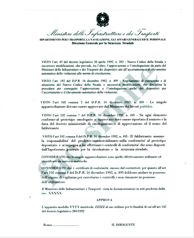 E' chiaro che da detta lettura ci debba essere un decreto ministeriale, sia esso di omologazione o di approvazione, ma si ricorda ancora come detto nel capitolo dell'omologazione per quanto alla sent. 113/2015 della Corte Costituzionale che per quanto all'art 142 comma 6 del C.d.S. quale norma specifica, gli strumenti di misura nel campione o modello debbono essere "debitamente omologati", per cui in questo caso, appunto degli autovelox, deve essere riportato: il numero e la data del decreto ministeriale di omologazione.
