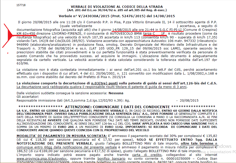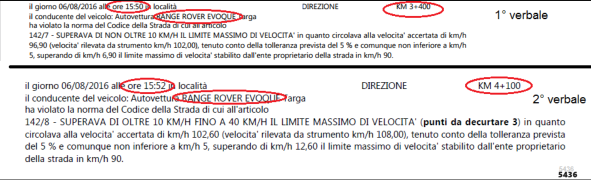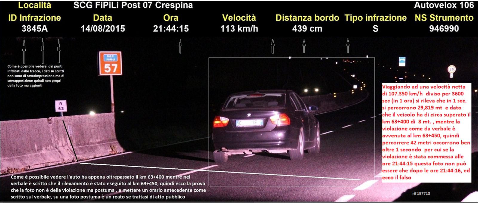 Nel caso degli autovelox, i cui rilevamenti vengono eseguiti a non meno di 1/1000 di secondo, conteggiati ai fini della determinazione della violazione e del comma da applicarsi, non possono essere poi ignorati sia sul verbale che con dati sovrapposti sulla foto, tanto che ad esempio, come nelle due immagini in appresso (foto del veicolo e del verbale) si comprende appunto anche la falsità degli agenti nell’attestare che la foto sia della violazione ma scattata in tempi successivi quindi anche l’ipotesi di falso nel riportare sulla foto un orario antecedente alla violazione seppur di mm/s.