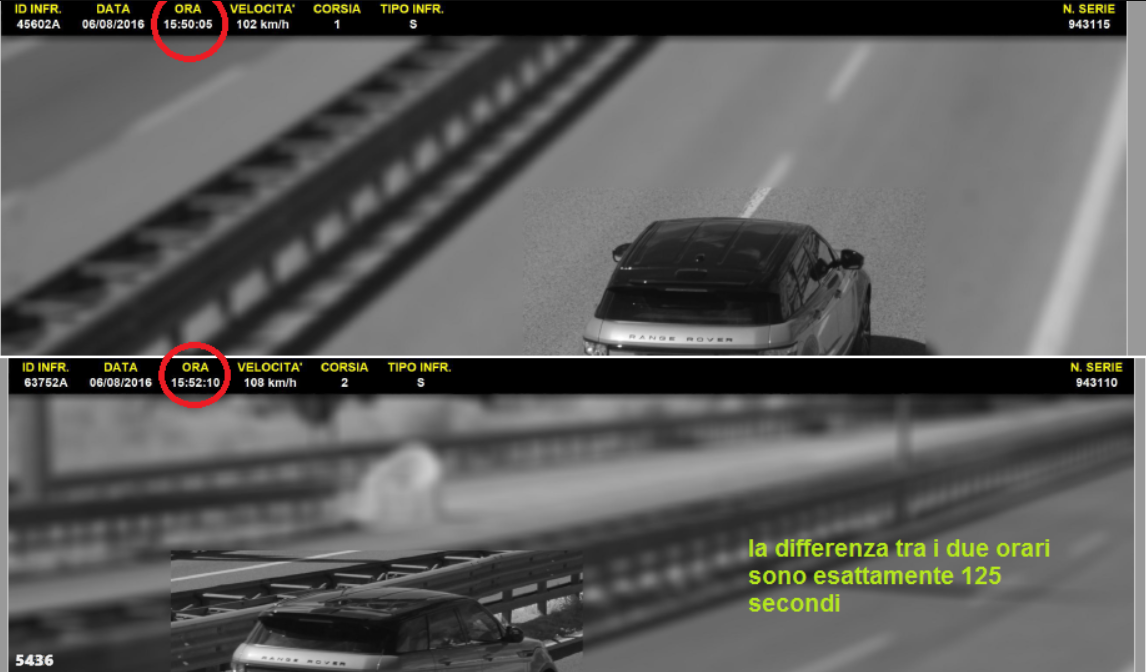 Altro esempio che dimostra l’inattendibilità degli strumenti ed in particolare della taratura in quanto come da parte dei verbali sottostanti, il tempo di intervallo tra i due rilevamenti sono di 2 minuti che se invece visti dalle foto sono 2 minuti e 5 secondi ovvero 125 secondi e lo spazio tra le due postazioni autovelox 700 mt.